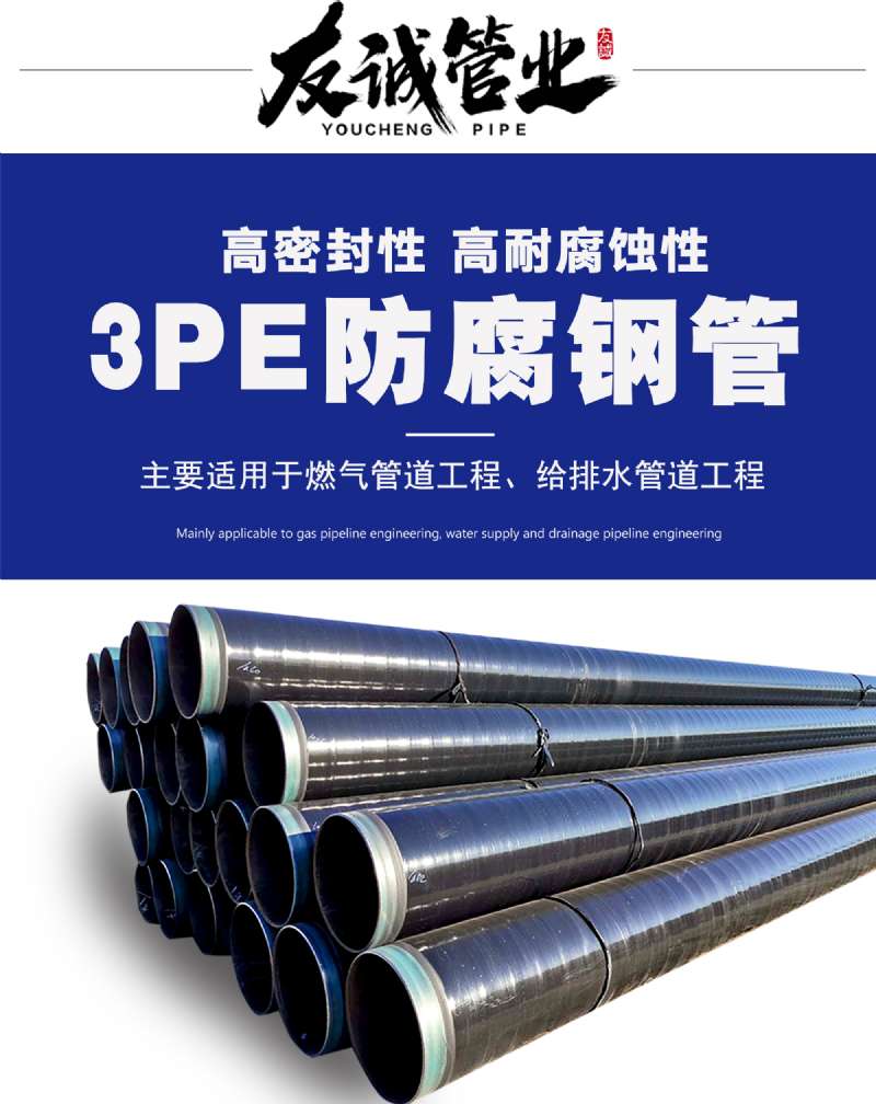 第一層環氧粉末(FBE>100um),第二層膠粘劑(AD)170~250um,第三層聚乙烯(PE)2.5~3.7mm。三種材料融為一體,并與鋼管牢固結合形成優良的防腐層。