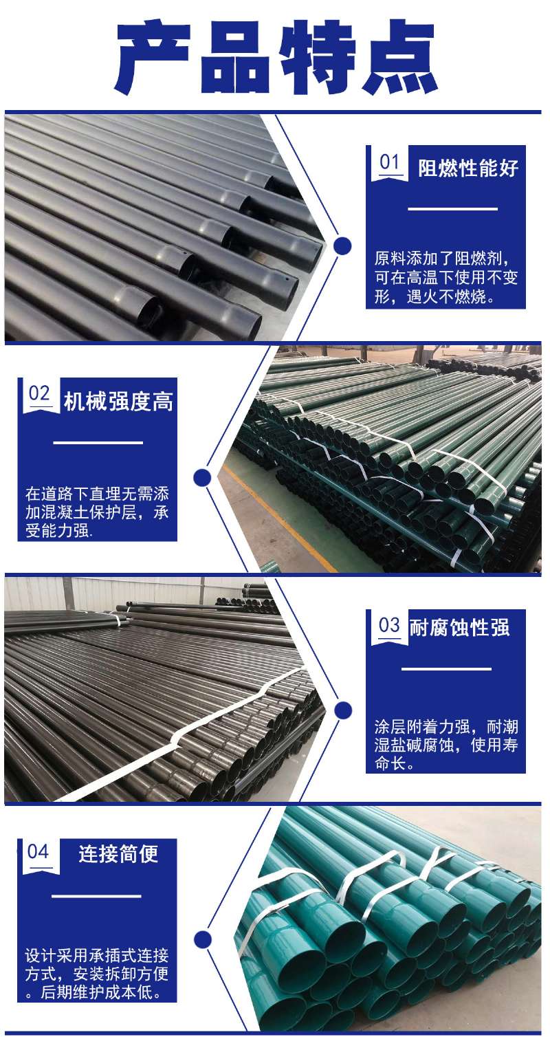 • 熱浸塑穿線管隨著電力電纜埋地敷設工程的迅速發展,對電纜套管提出的更高要求,熱浸塑穿線管是以高強度的鋼管為基礎材料,不飽的聚酯樹脂為基體材料,采用熱浸塑而成。